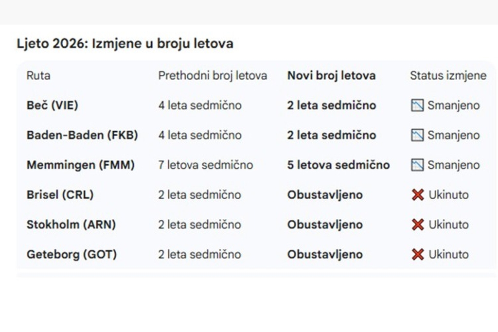 U Banjaluci biće ukinuto šest sedmičnih polazaka, dok su letovi za Beč, Memmingen i Baden-Baden svedeni na dvije sedmične rotacije.