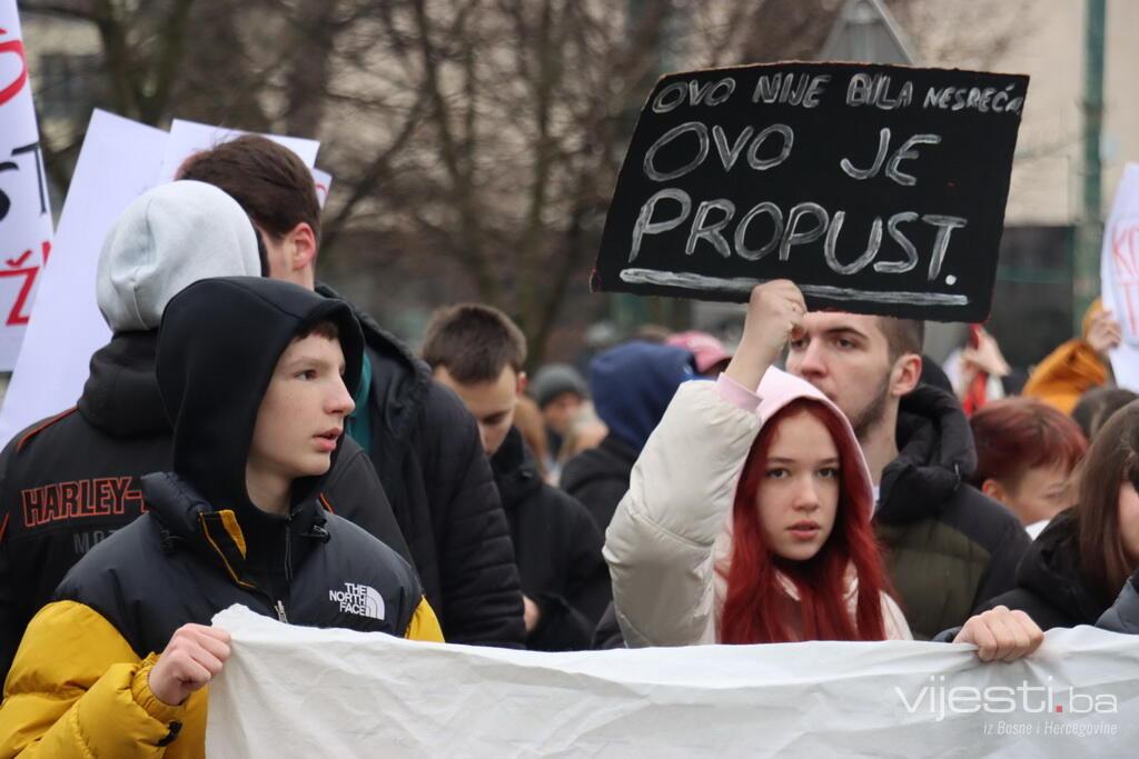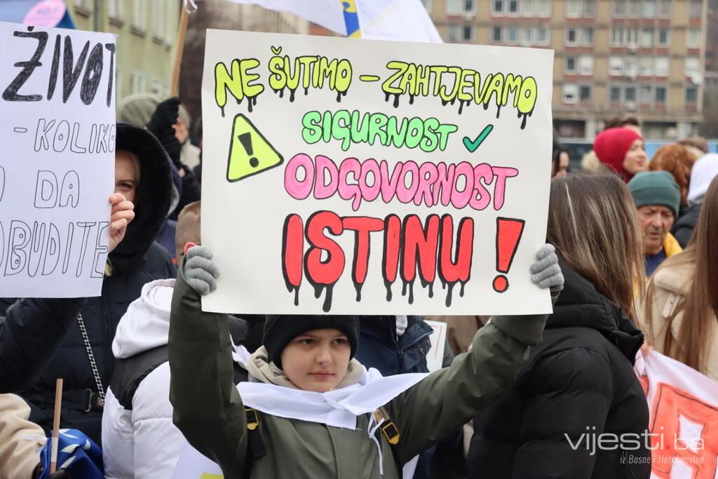 12.00 - Mladi nose transparente sa snažnim porukama: "Nema naših i vaših u odgovornosti", "Mali, ali hrabri", "Dosta je krvavih posljedica tuđe odgovornosti", "Skupo plaćamo cijenu jeftinih kočnica"...