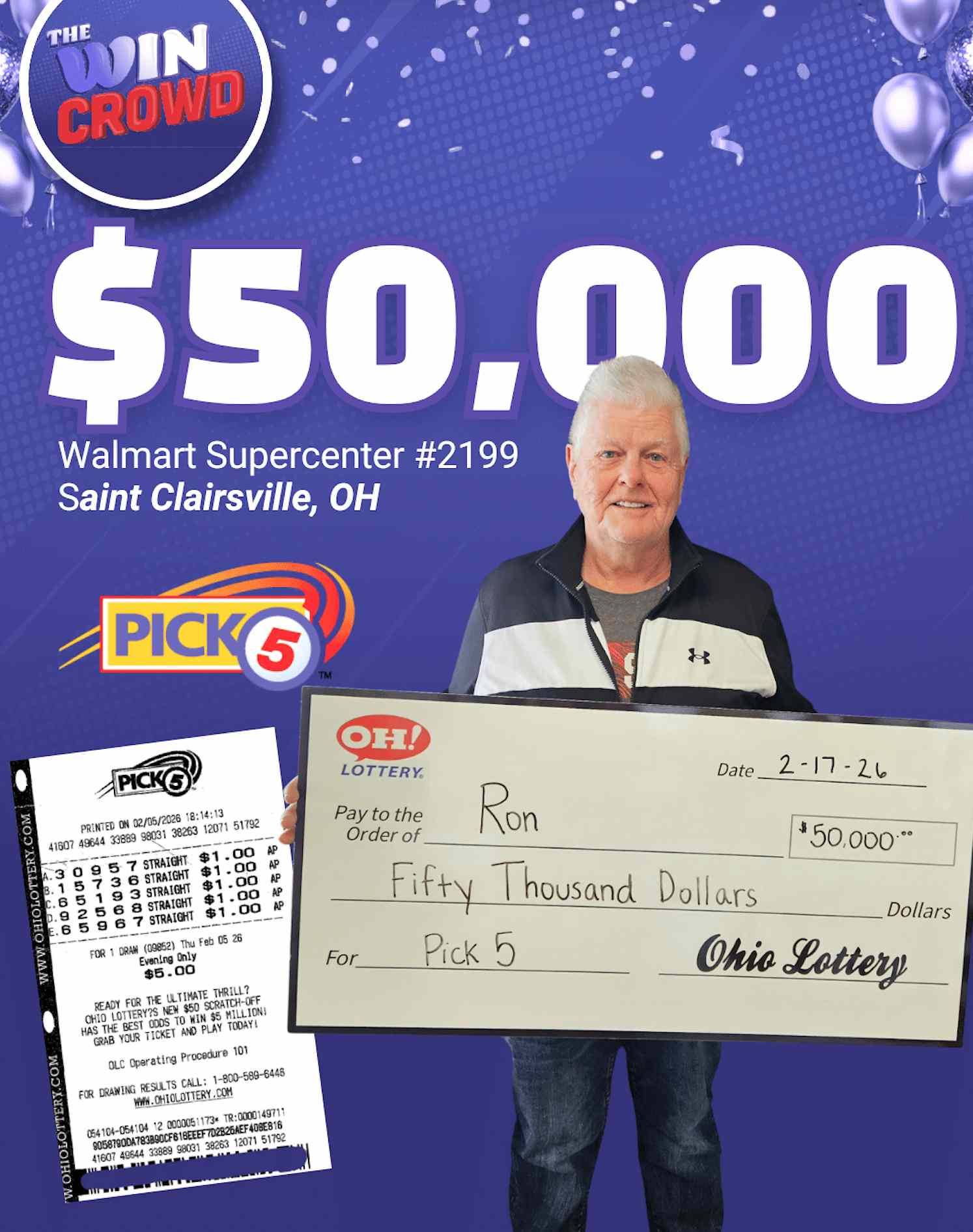 U igri Pick 5 treba pogoditi pet brojeva tačnim redoslijedom, a šanse su jedan prema 100.000. Ron je odabrao brojeve 3-0-9-5-7, a upravo su ti brojevi izvučeni 5. februara. Iako je kupio pogrešan listić, ispalo je da mu je ta zabuna donijela sreću. Nakon odbitka poreza, na račun će mu sjesti 36.625 dolara (31.087,30 eura).
