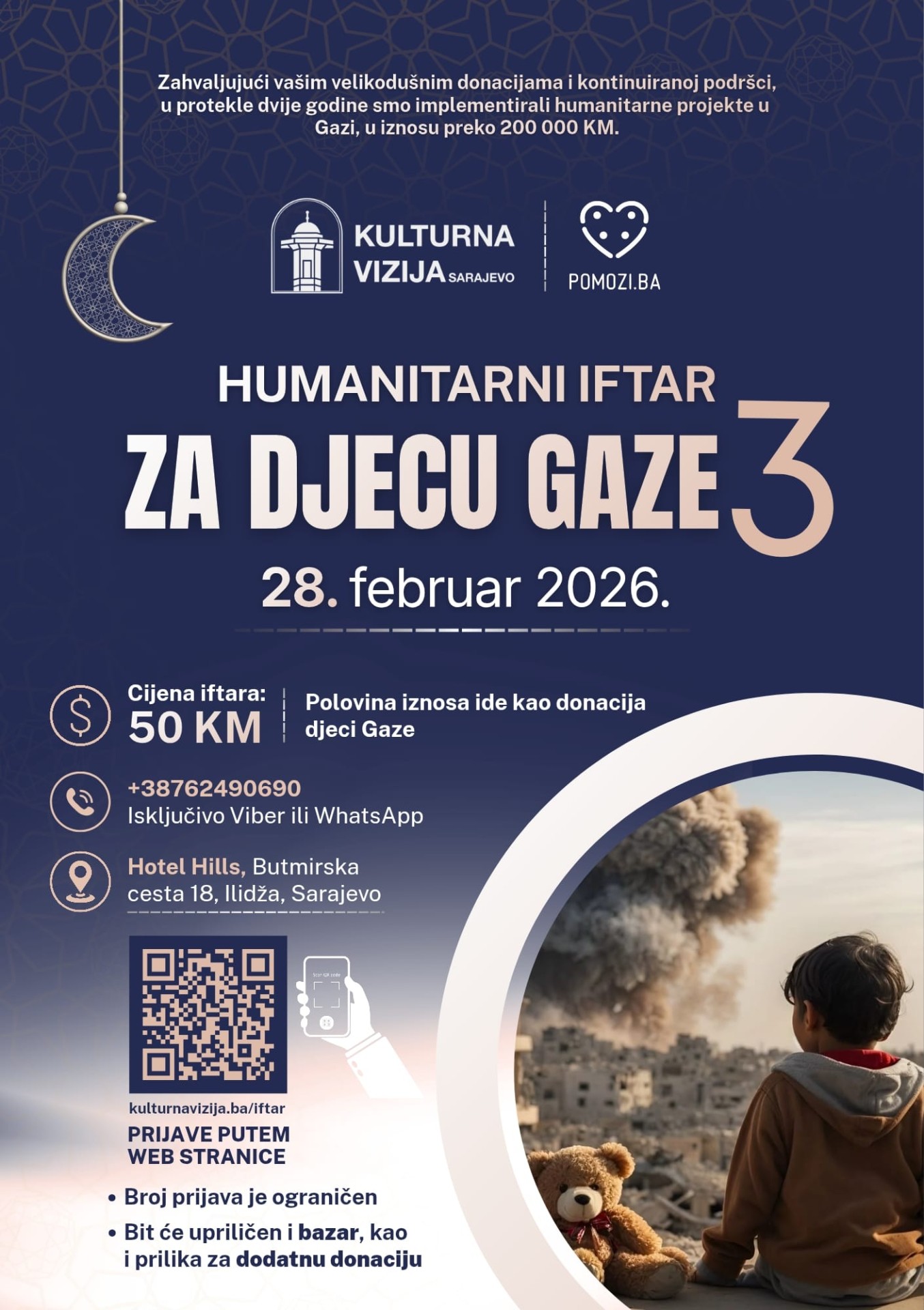 Fondacija Kulturna Vizija u saradnji sa Udruženjem Pomozi.ba organizuje humanitarni iftar, kao dio kontinuirane misije pružanja pomoći ugroženim zajednicama u Gazi.