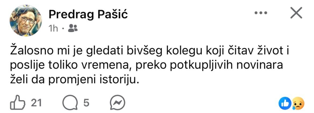 "Žalosno mi je gledati bivšeg kolegu koji čitav život i poslije toliko vremena, preko potkupljivih novinara želi da promijeni istoriju", napisao je Pašić na svom Facebook profilu.
