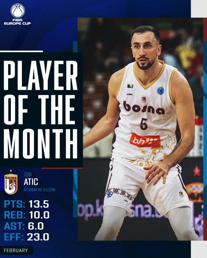 Edin Atić bio je glavni organizator igre KK Bosna BH Telecom na oba kraja terena, a kao kruna sjajnih partija proglašen je MVP-jem mjeseca februara FIBA Europa Cupa.