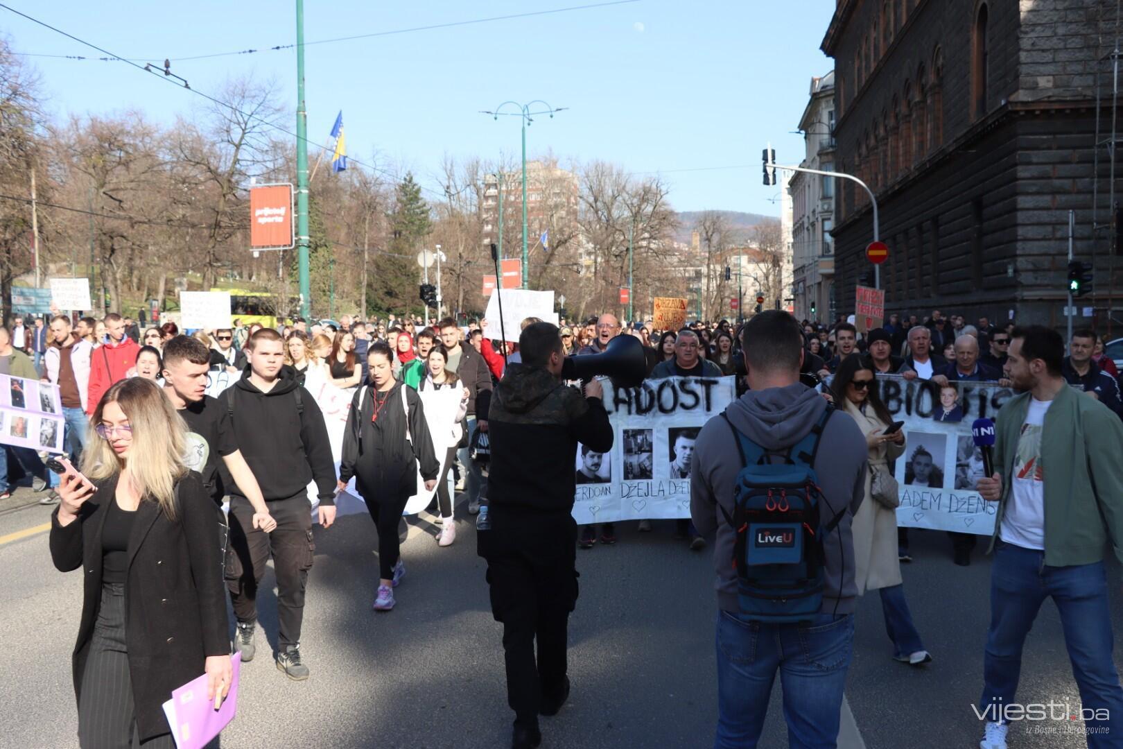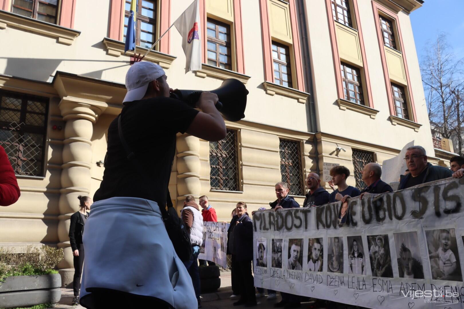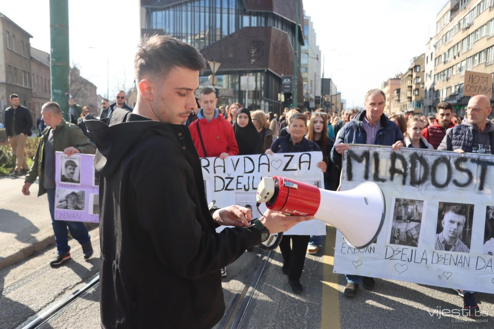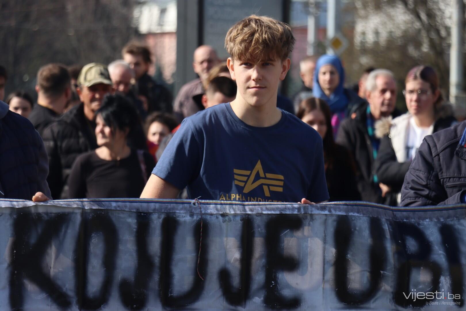 14.14 Kerim Žuga, srednjoškolac obratio se ispred Tužilaštva KS. "Počnite raditi svoj posao, zahtjeve imate, šta čekate? Dajte nam rješenja, a ne izgovore, dajte nam smjene jer možda dođe vlada nade. Imenujte krivce i direktora Studentskog doma i sve druge funkcije po znanju i poslu, ne po rodbinskoj i stranačkoj vezi. Mi tražimo pravdu i nećemo stati dok je ne dobijemo", kazao je.