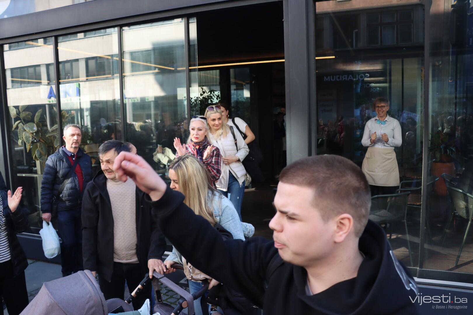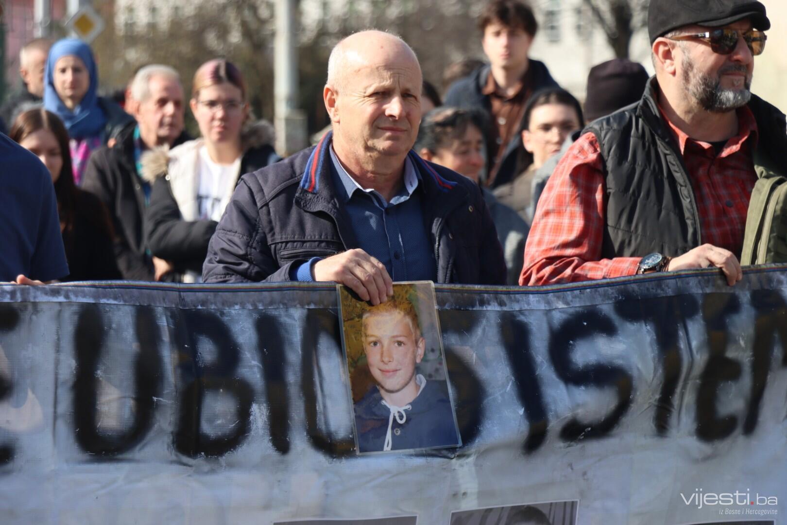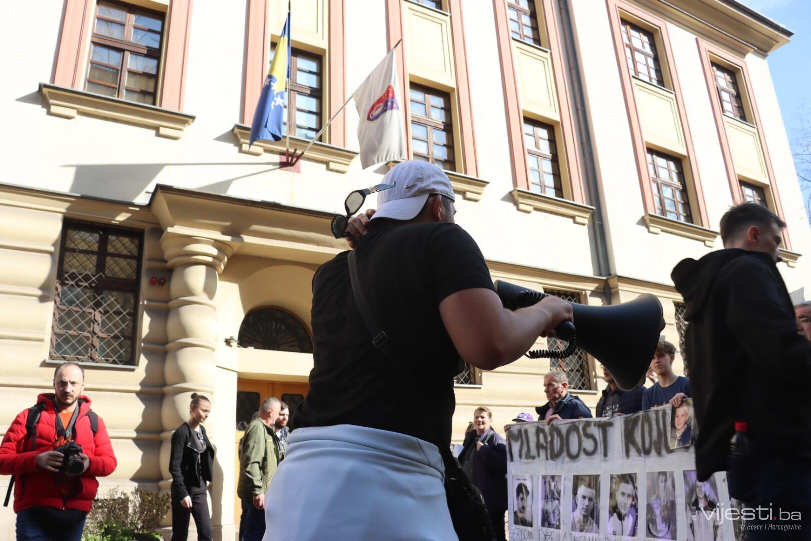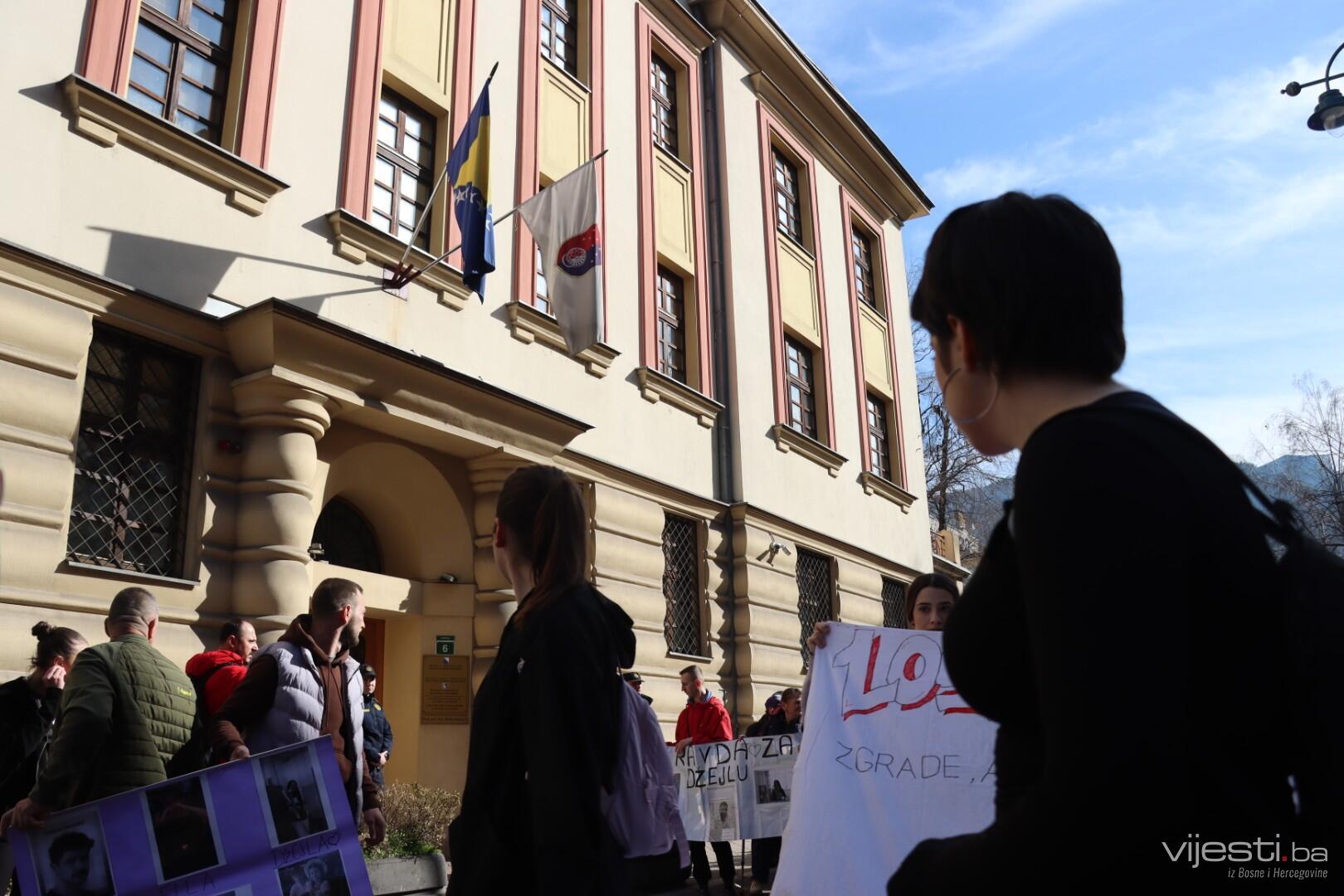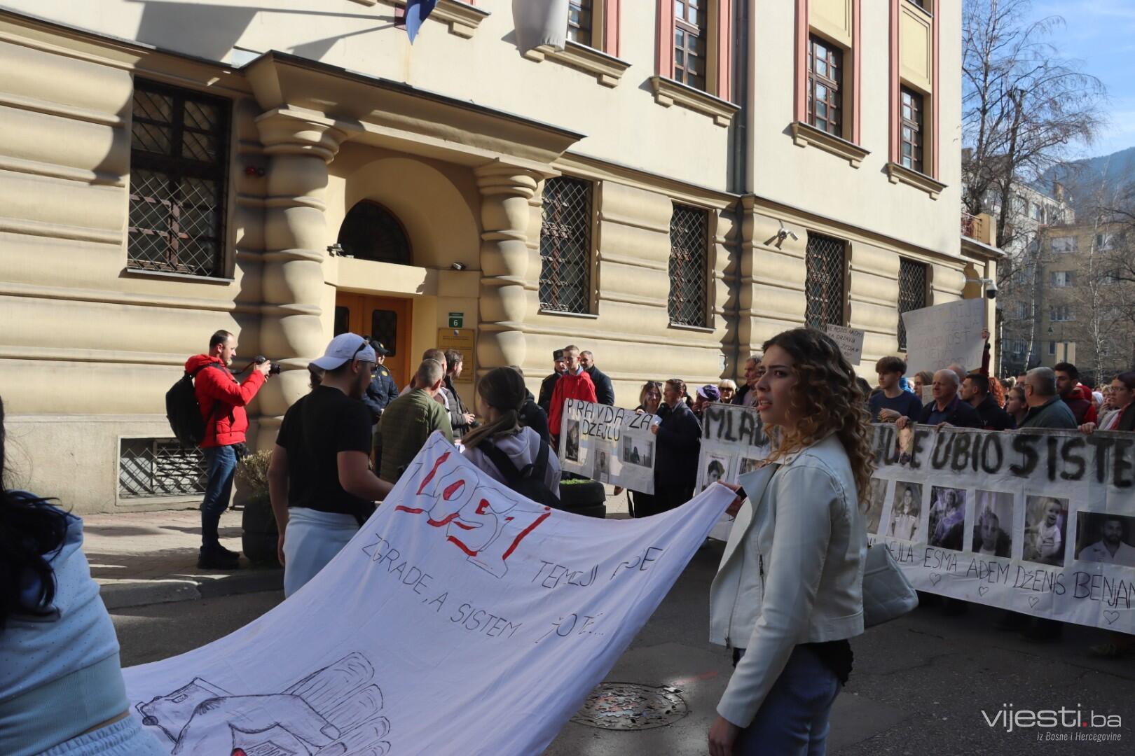 14.00 Okupljeni pozivaju uposlenike Tužilaštva da izađu na prozore i pogledaju fotografije ubijene djece na transparentima koje su donijeli.