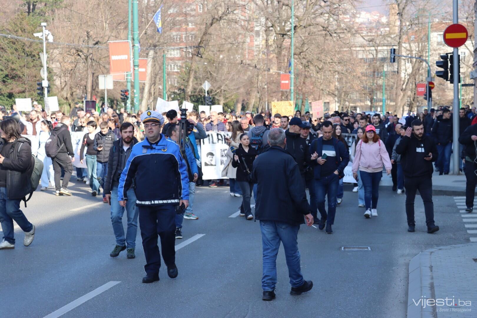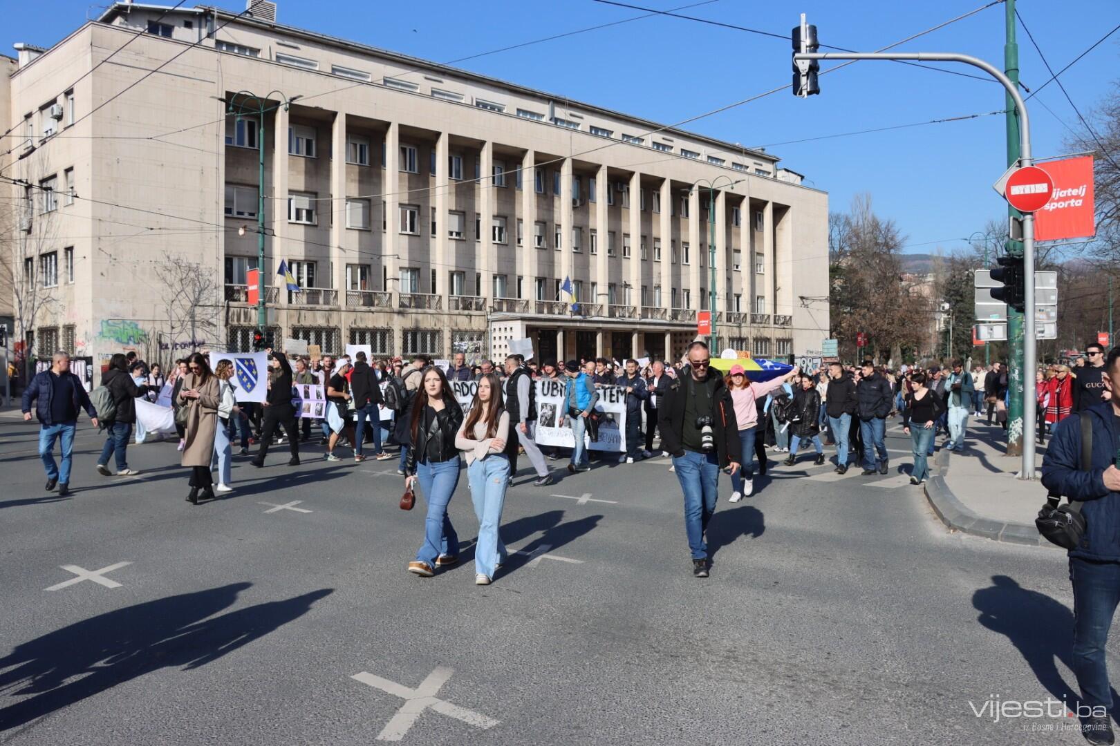14.33 Kolona je stigla do zgrade Predsjedništva BiH na ruti kojom se vraća pred Zemaljski muzej, odakle je i današnji protest krenuo.