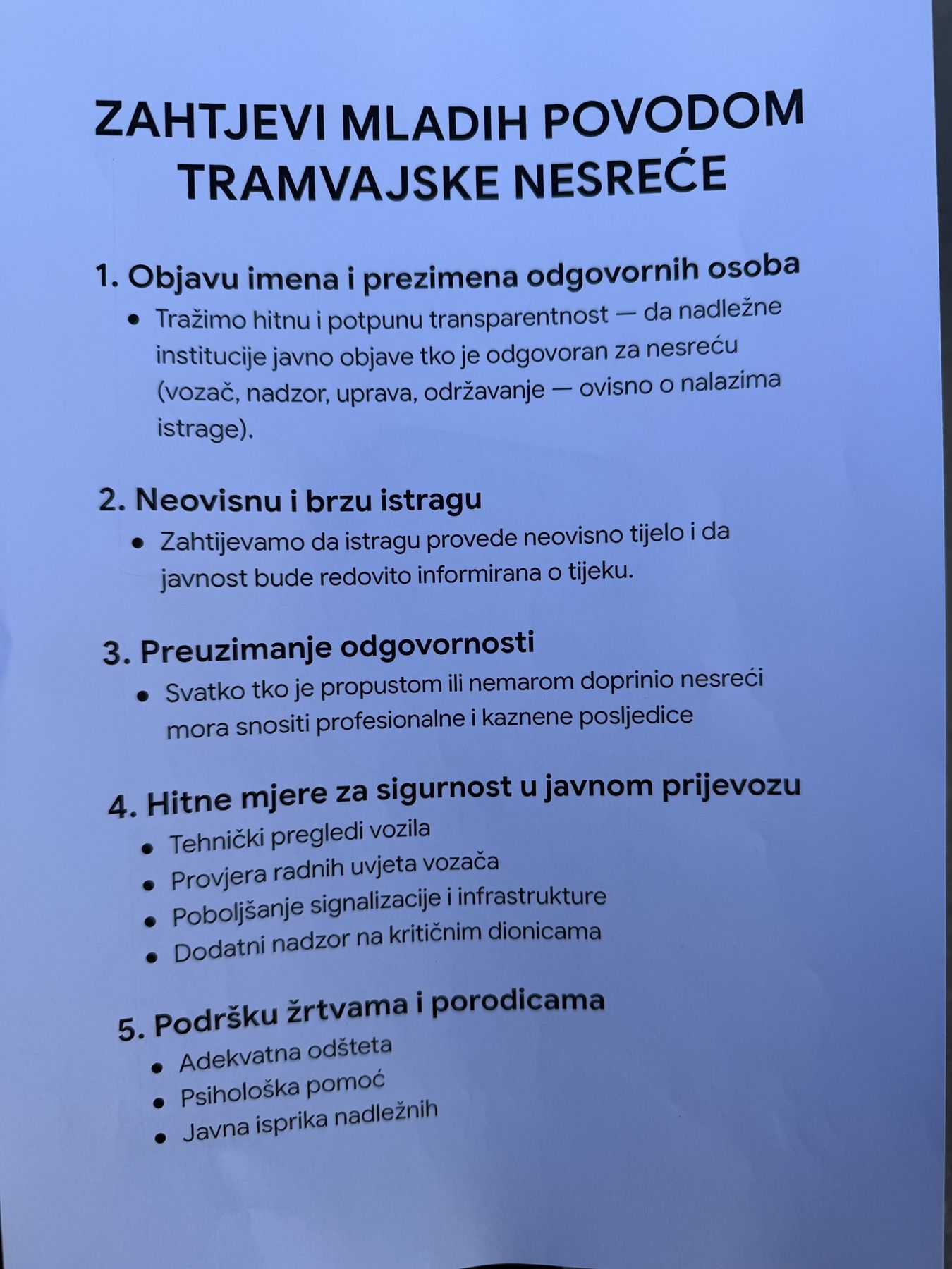 Podsjetimo, građani traže potpunu transparentnost istrage, uključujući podatke o servisiranju tramvaja i snimak kamere iz vozila u trenutku nesreće; Trajno povlačenje starih tramvaja iz saobraćaja dok ne prođu ponovno servisiranje i javna objava njihove tehničke ispravnosti; Ostavke odgovornih lica u upravi javnog prijevoza i vlasti; Izgradnja sigurnog i kvalitetnog javnog prijevoza u Sarajevu.