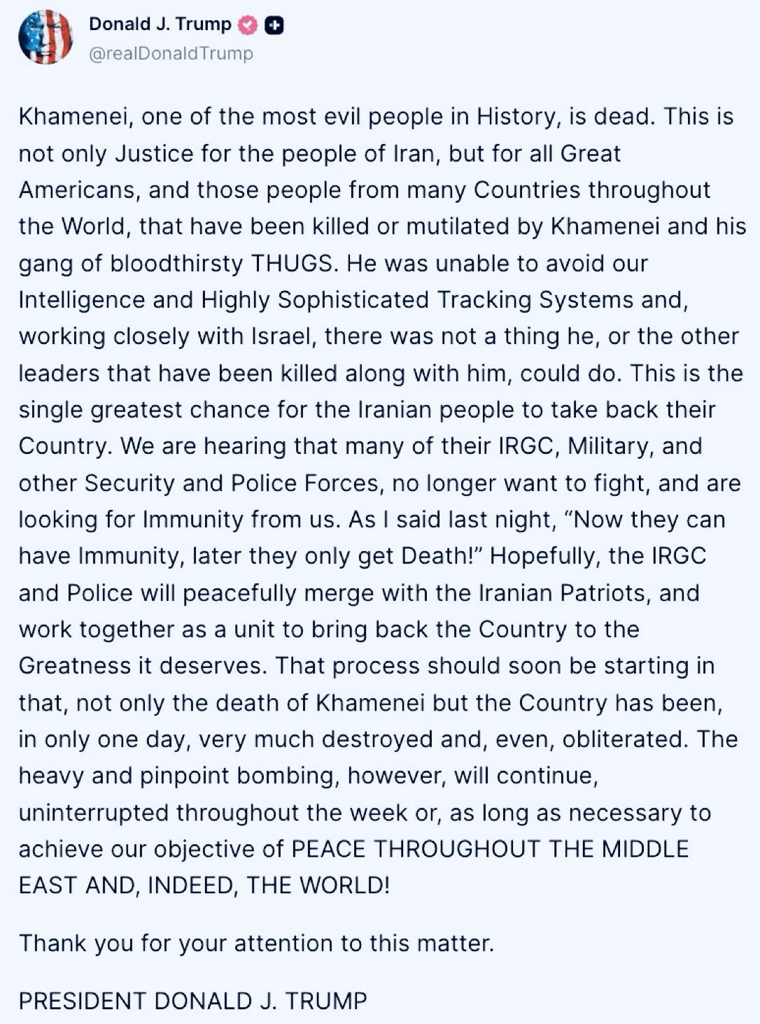 Taj proces bi uskoro trebao početi jer je, ne samo smrću Khameneija, već i sama zemlja u samo jednom danu u velikoj mjeri uništena, pa čak i zbrisana. Teško i precizno bombardovanje, međutim, nastavit će se bez prekida tokom sedmice ili onoliko dugo koliko bude potrebno da se ostvari naš cilj – MIR NA BLISKOM ISTOKU I, UISTINU, U SVIJETU!", poručio je Trump.