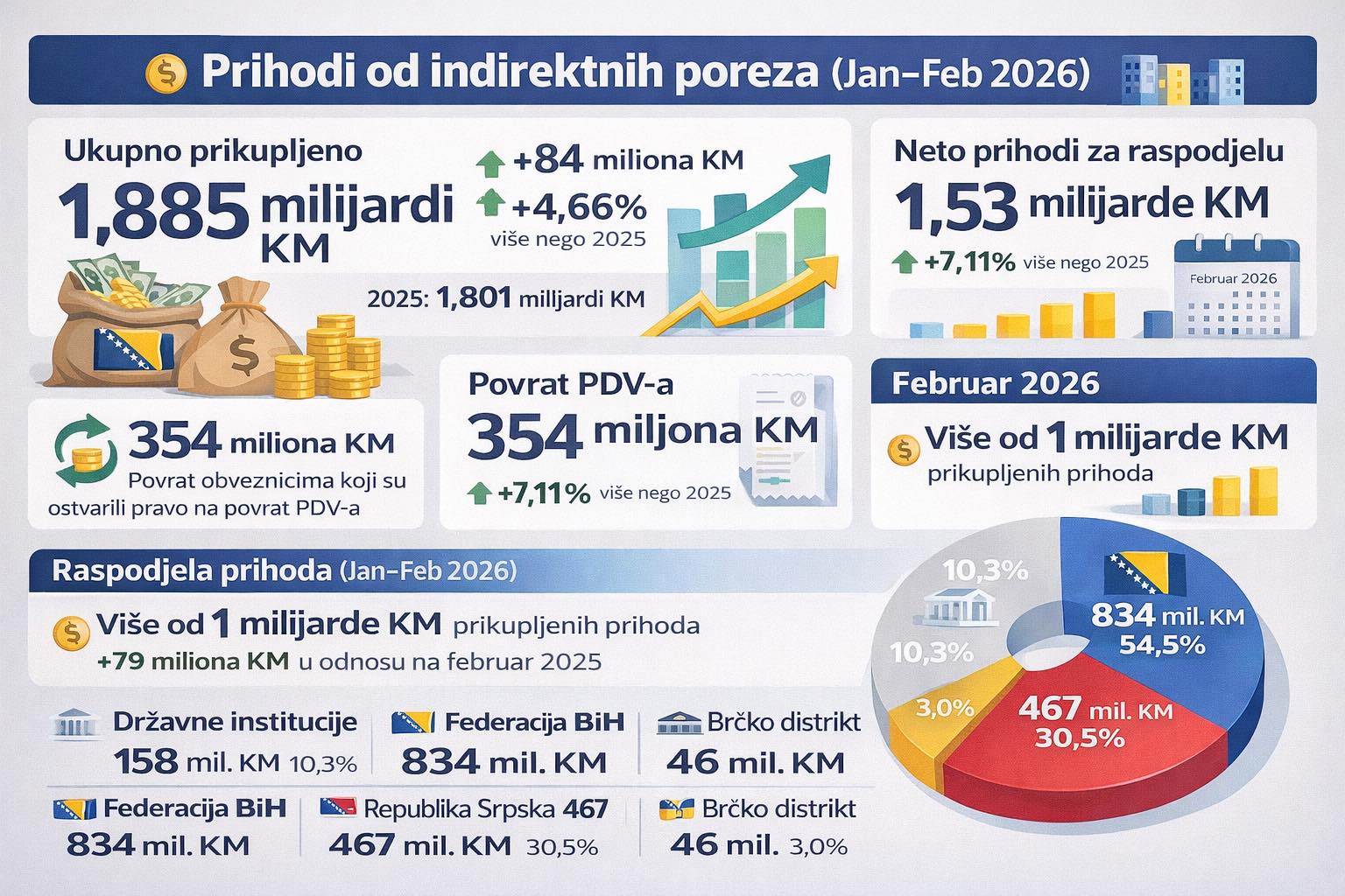 UIO BIH danas je objavila kako su prihodi od indirektnih poreza u prva dva mjeseca 2026. godine iznosili su 1 milijardu i 885 milion KM.