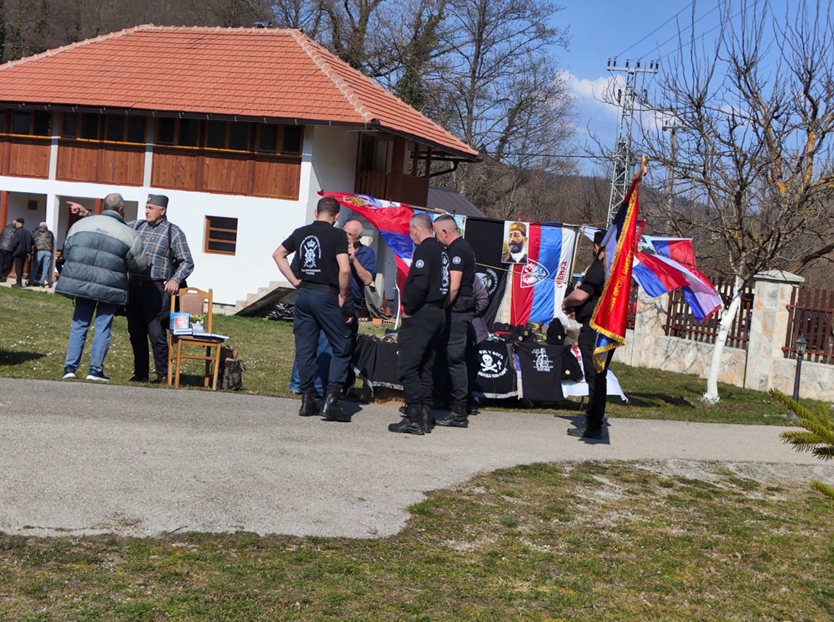 Na ulazu u dvorište manastira nekoliko štandova na kojima se prodaju majice, kape, srpske i ruske zastave te druga obilježja koja asociraju na Drugi svjetski i rat u BiH. Prodavač novinare pita da li su "turska ili srpska televizija", uz komentare drugih prodavača da su "opet došli zavaditi ljude".