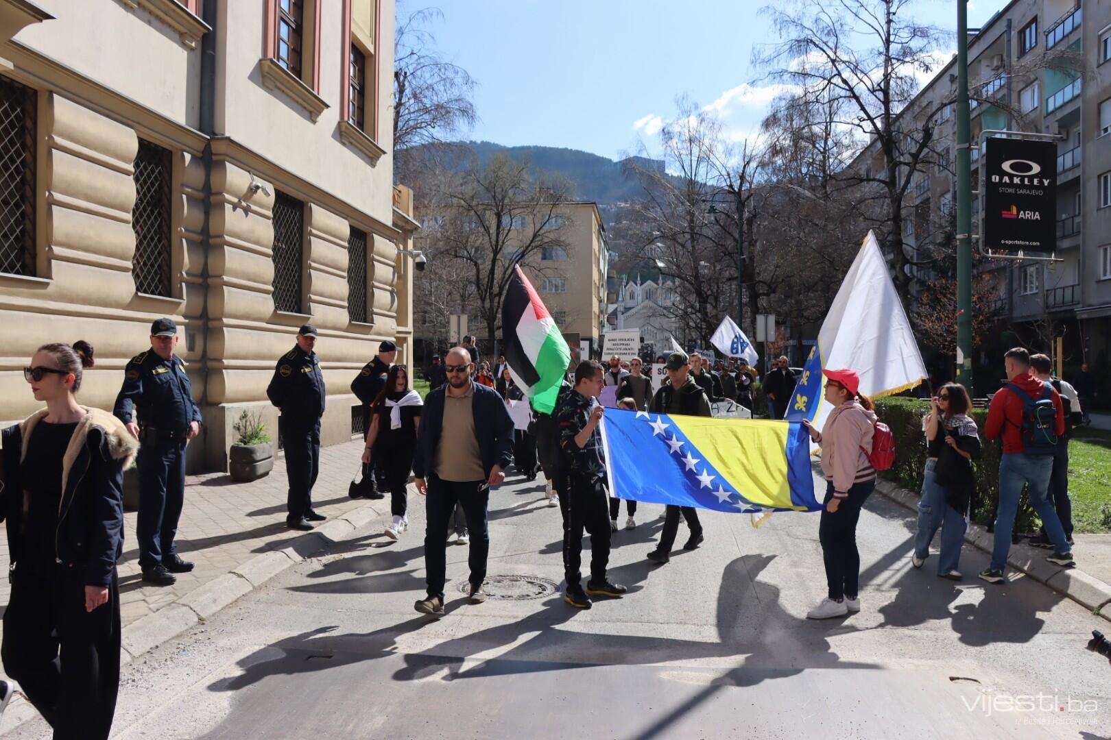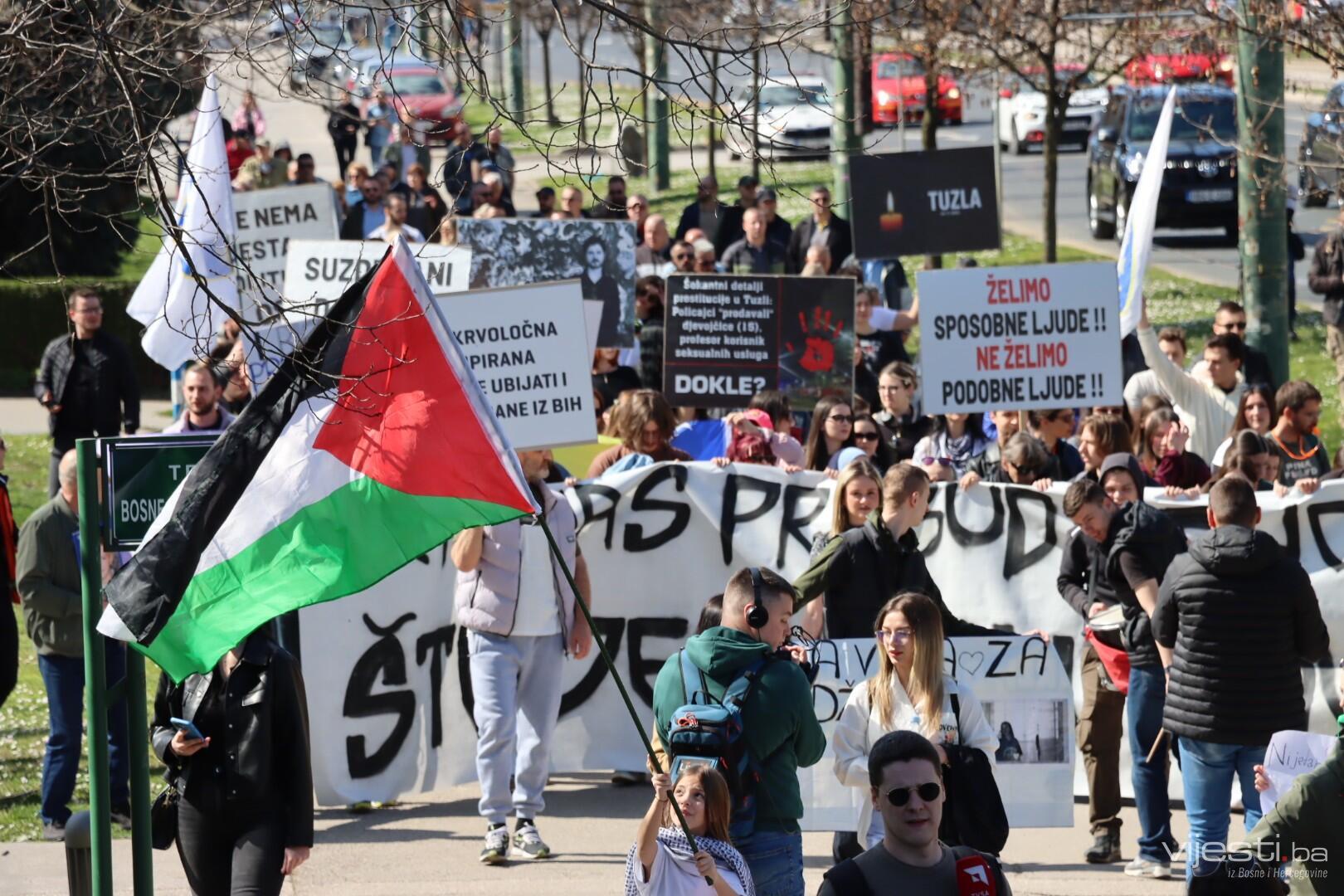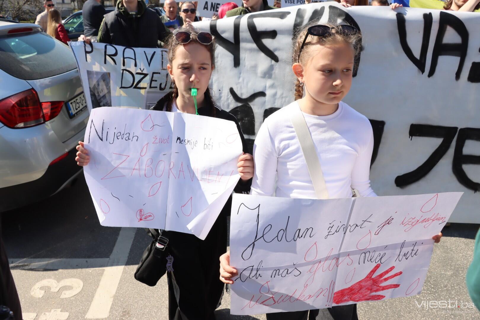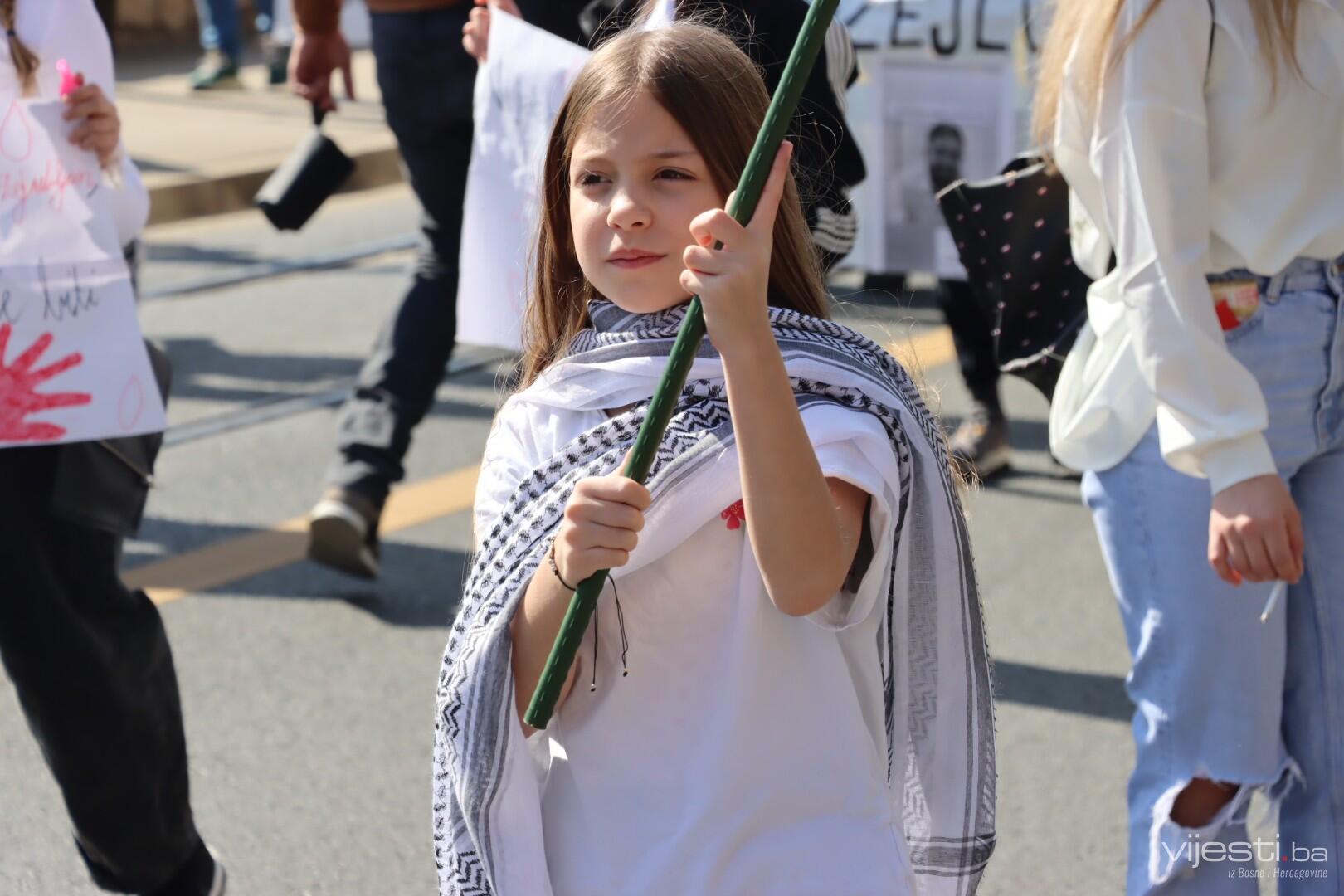 12:27 - "Nijedan život ne smije biti zaboravljen", poruka je koju nose mališani na današnjem protestu. Tu su i zastave Palestine.