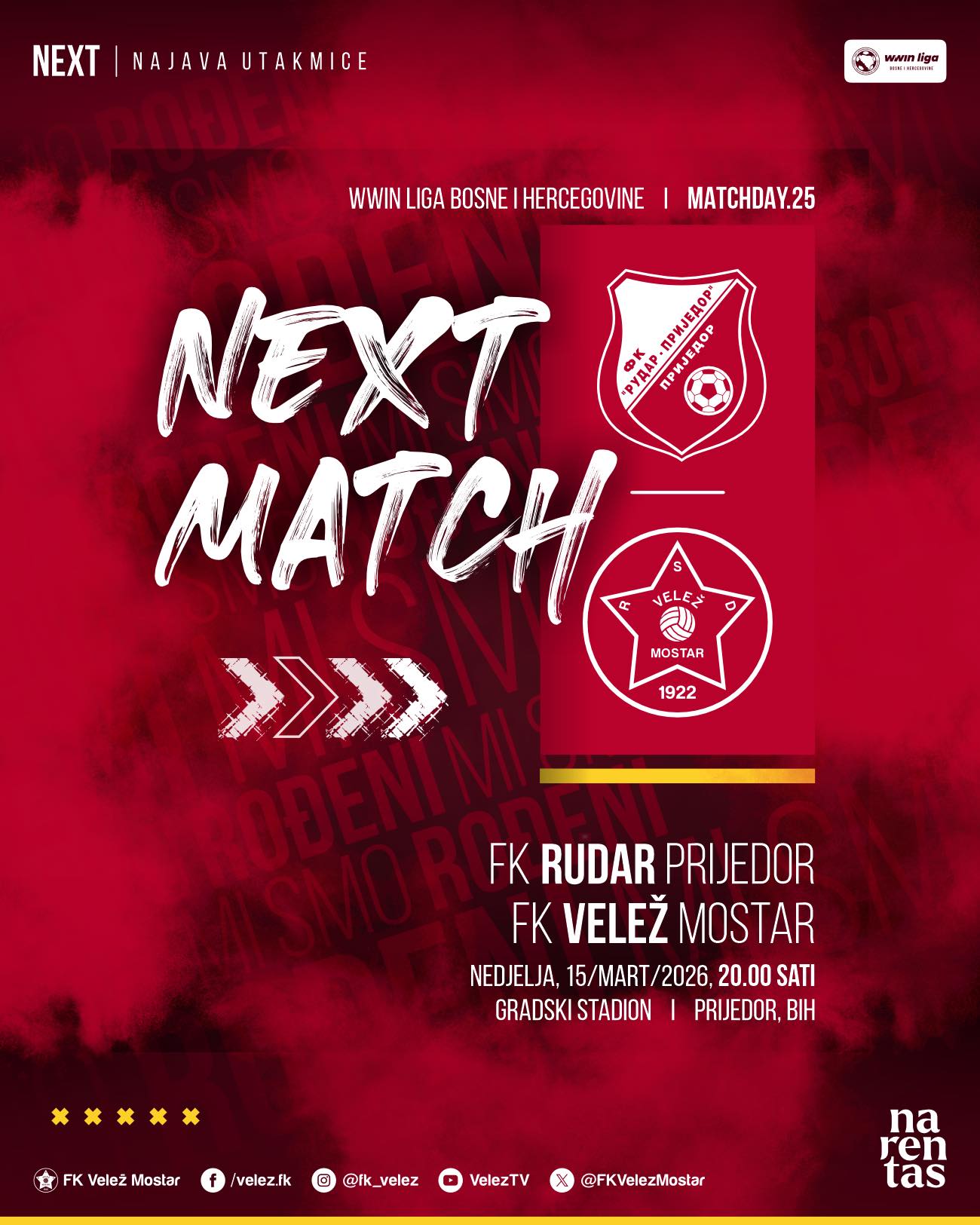 20:00 Rudar Prijedor – Velež (Arena 1 Premium)