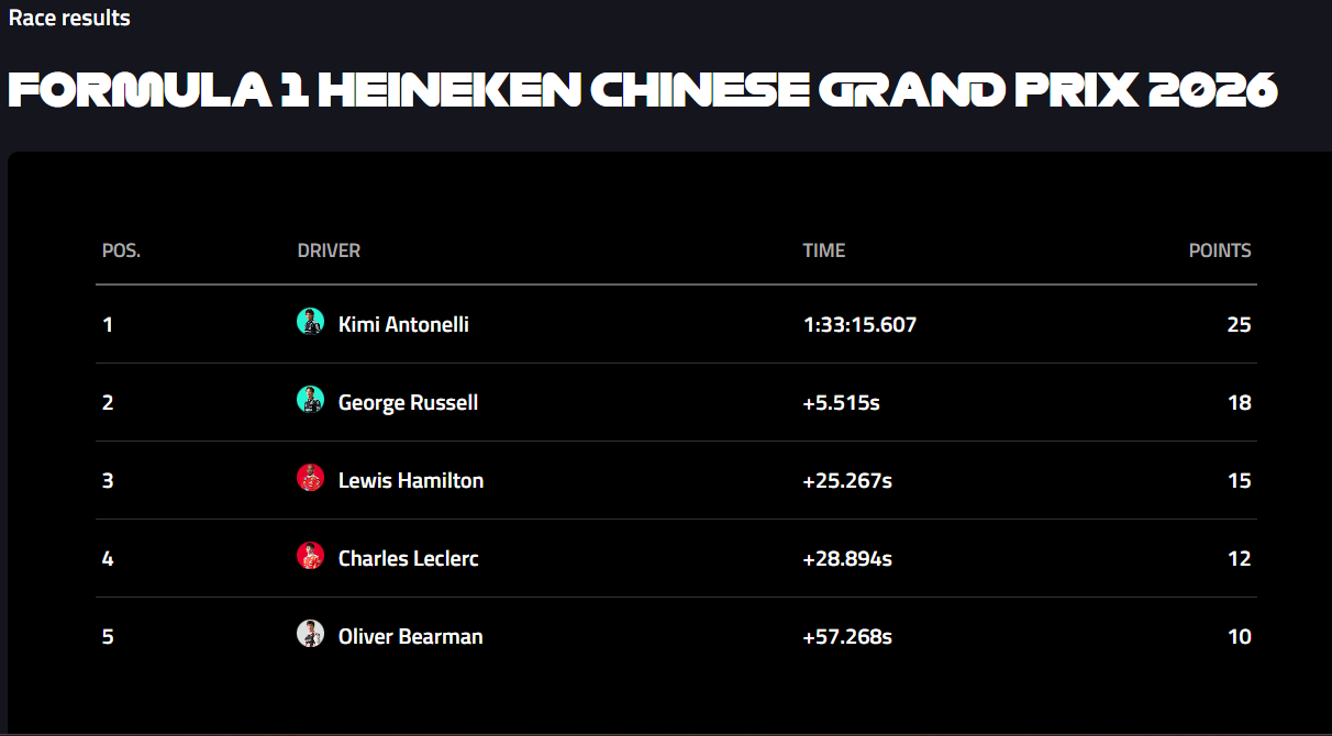 U ukupnom poretku vodi Russell s 51 bodom, drugi je Antonelli sa 47, treći Leclerc sa 34, a četvrti Hamilton s 33 boda.
