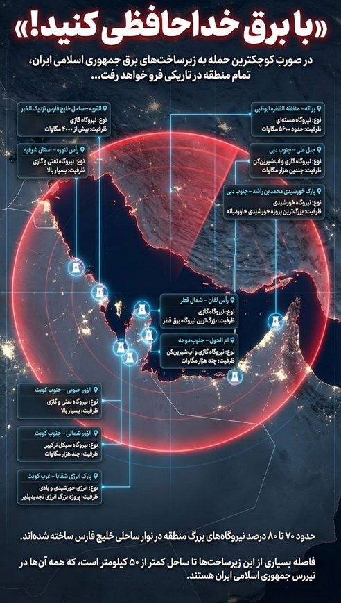 U tekstu na dnu grafike navodi se da se 70 do 80 posto velikih elektrana u regiji nalazi uz obalu Perzijskog zaljeva te da je velik dio te infrastrukture udaljen manje od 50 kilometara od mora, zbog čega je, kako se tvrdi, u dometu iranskih projektila, prenosi Index.hr.