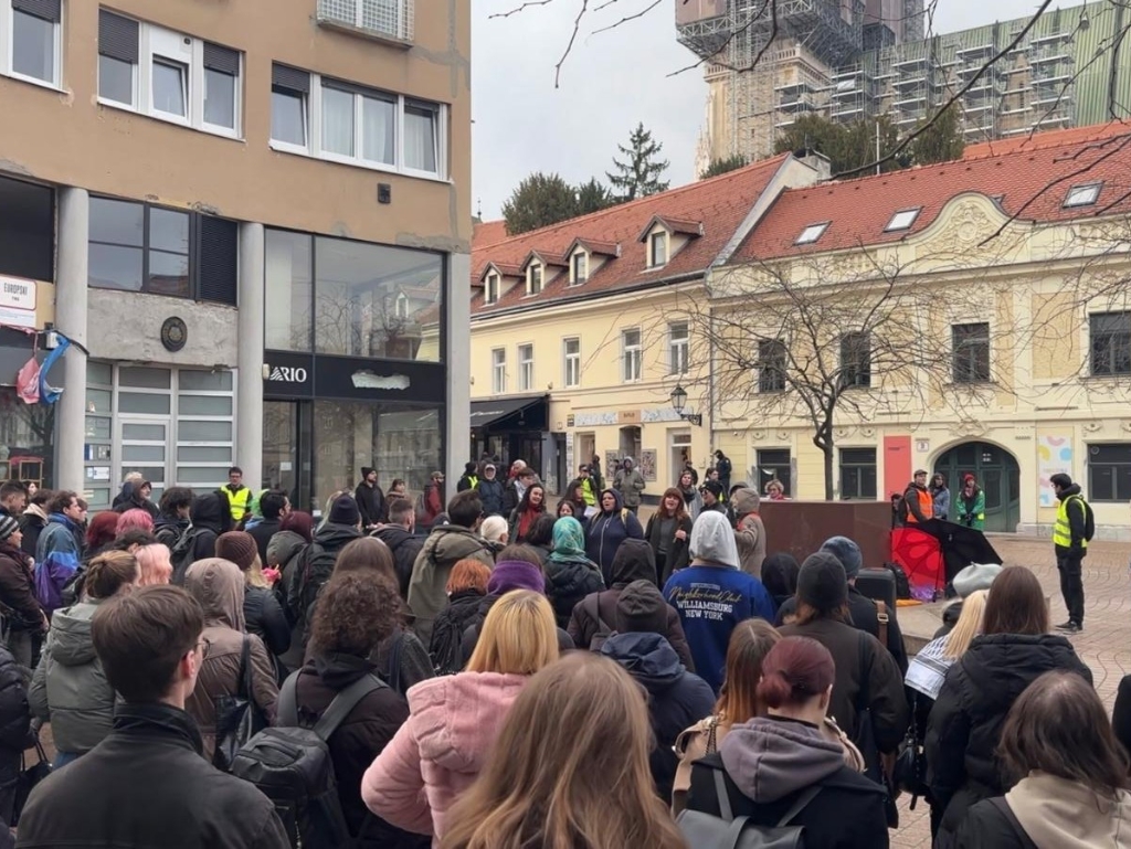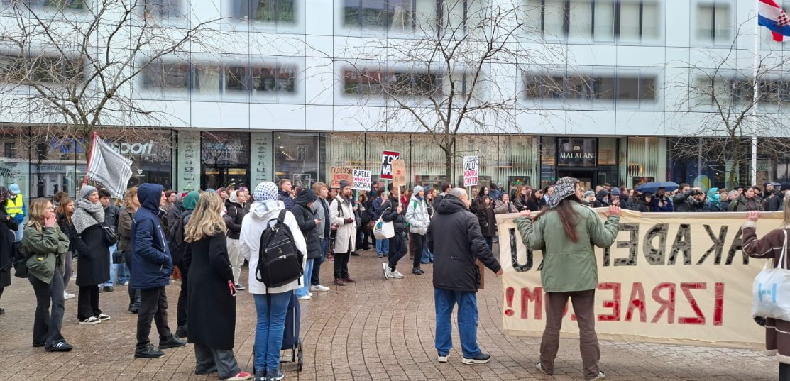 Nekoliko stotina ljudi okupilo se na zagrebačkom Evropskom trgu ovaj ponedjeljak u 17 sati na protestu "Prekinimo akademsku saradnju s Izraelom!" u organizaciji inicijativa: Studentice za Palestinu (SzP), Inicijativa za akademiju solidarnosti i epistemičke pravde (IZASEP) i Inicijativa za slobodnu Palestinu (FPI).