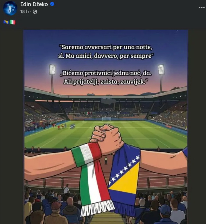 “Italija je prijateljska zemlja i bilo bi lijepo da, kada se intonira italijanska himna, svi ustanemo i aplaudiramo, jer su Italijani prvi došli u našu zemlju 1996. i odigrali prijateljsku utakmicu s nama, i zbog toga smo im zahvalni”, rekao je Džeko.