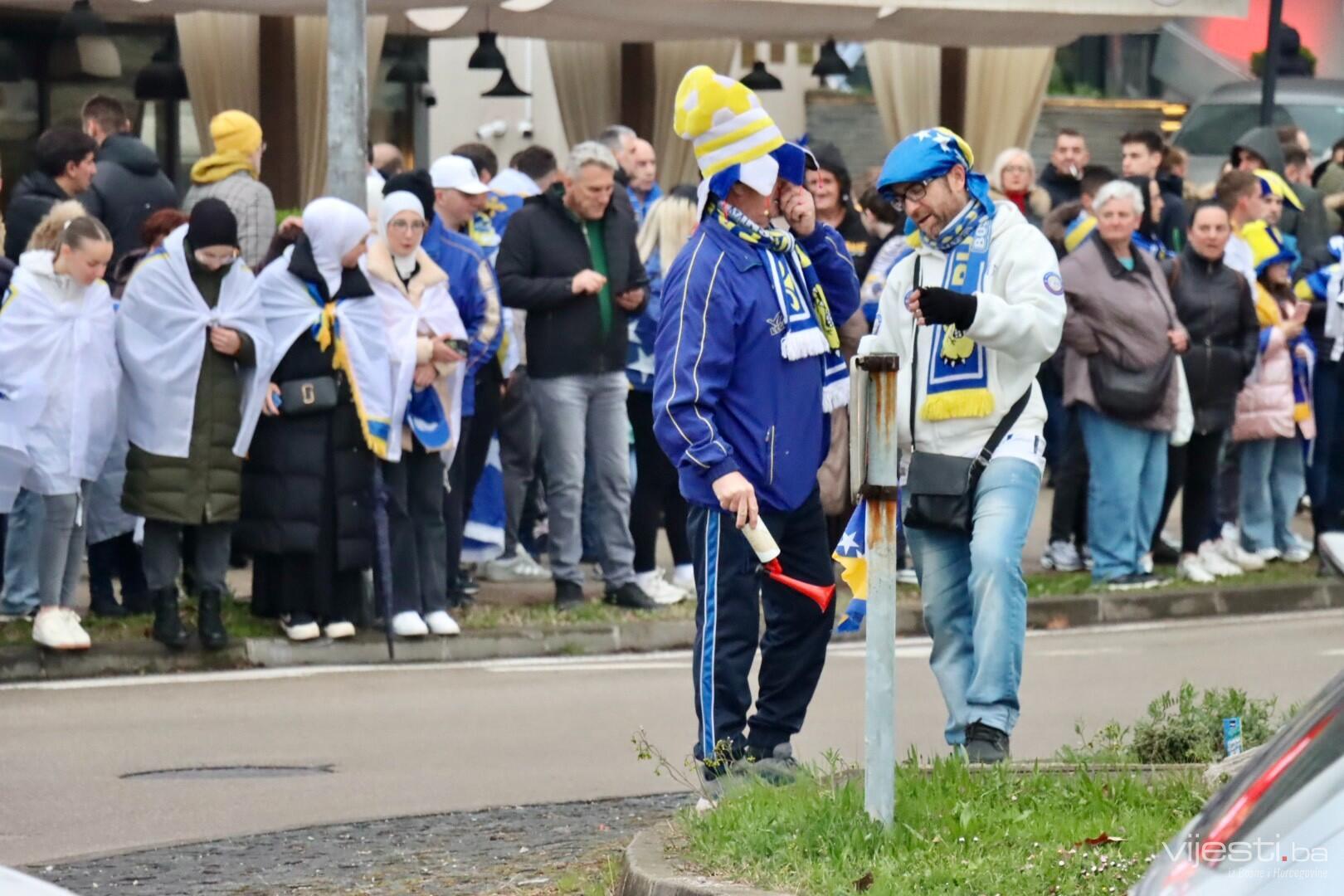 Grad je već satima u znaku reprezentacije, a centralno okupljanje navijača organizovano je ispred Arene Zenica. Odatle su se u velikom korteu uputili prema stadionu Bilino polje, uz pjesmu, baklje i prepoznatljivu navijačku energiju.
