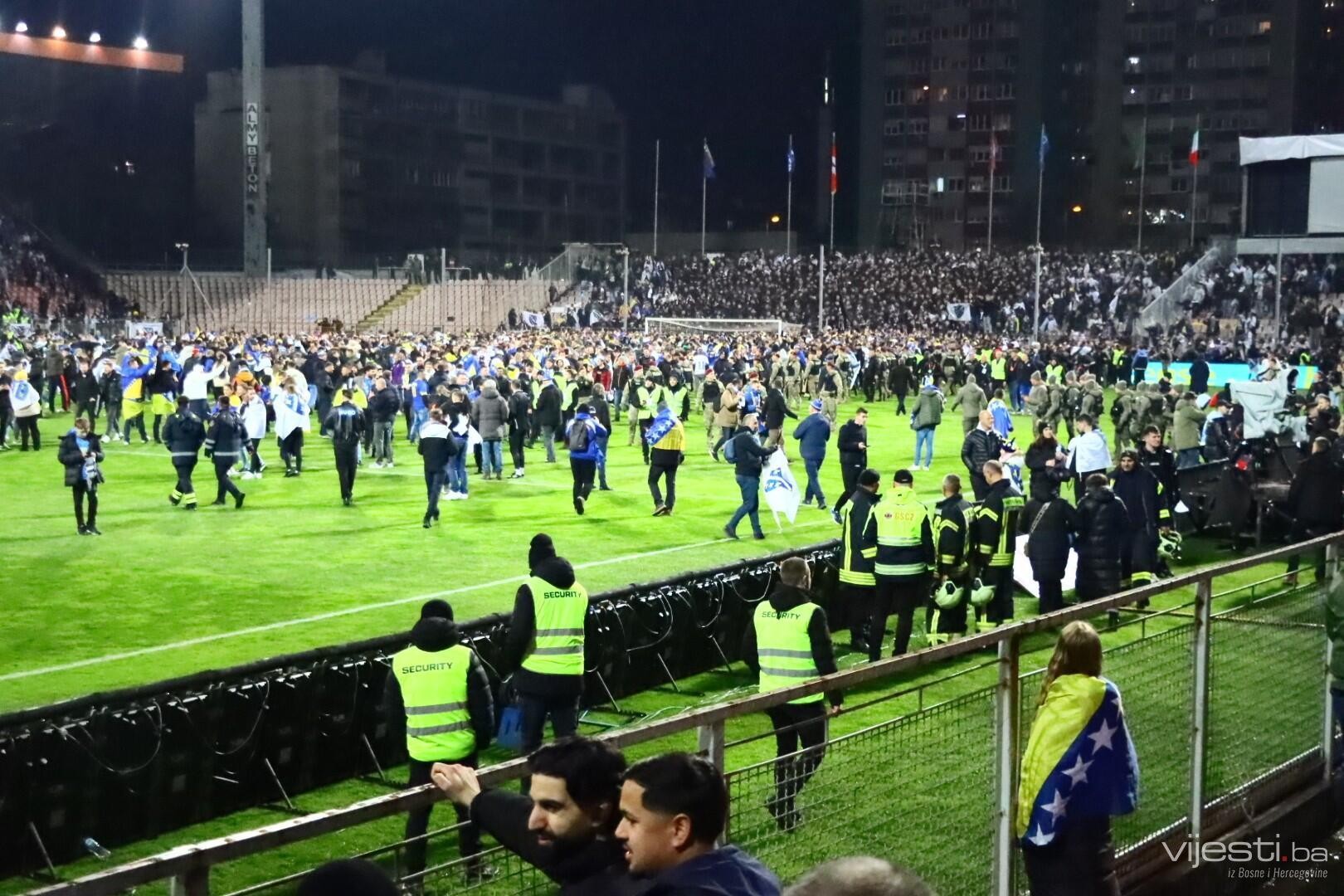 U trenutku kada je potvrđena pobjeda nad Italijom i plasman Bosne i Hercegovine na Svjetsko prvenstvo, tribine su se prelile na teren.
