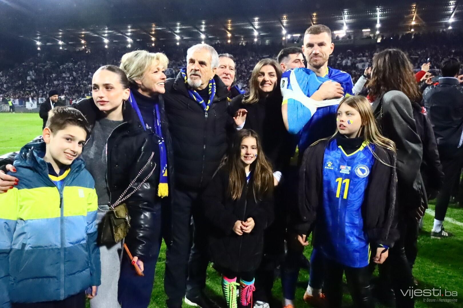 Ubrzo su stigle i porodice reprezentativaca. Među njima i najbliži kapitena Edina Džeke, koji su se probili kroz gužvu kako bi podijelili slavlje na samom terenu.