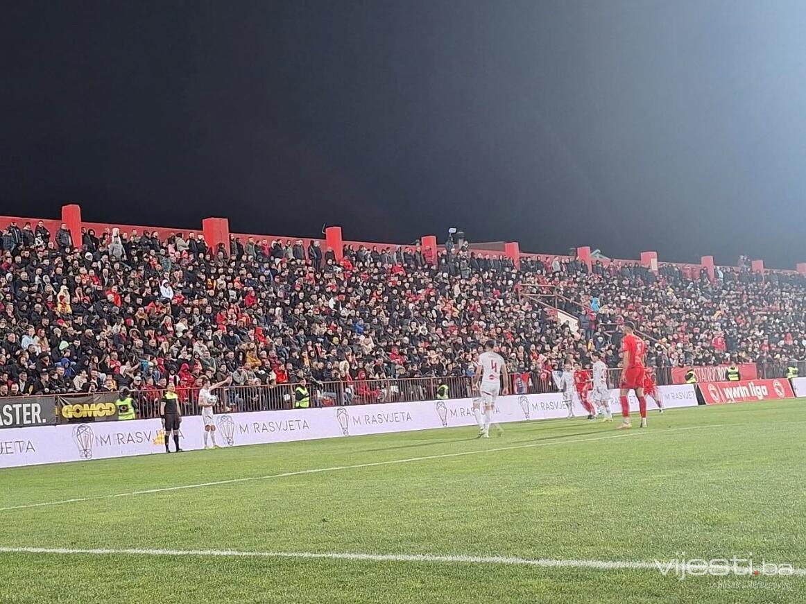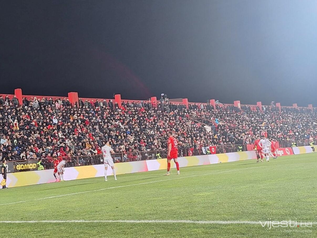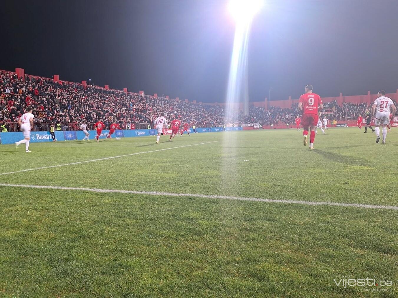 Susret je počeo vrlo žestoko, uz tri žuta kartona u prvih deset minuta, a u 14. minuti došlo je i do prekida. Navijači Veleža zapalili su baklje i trake ispred tribine, nakon čega se vatra proširila, pa je sudija morao zaustaviti igru dok vatrogasci nisu intervenisali.