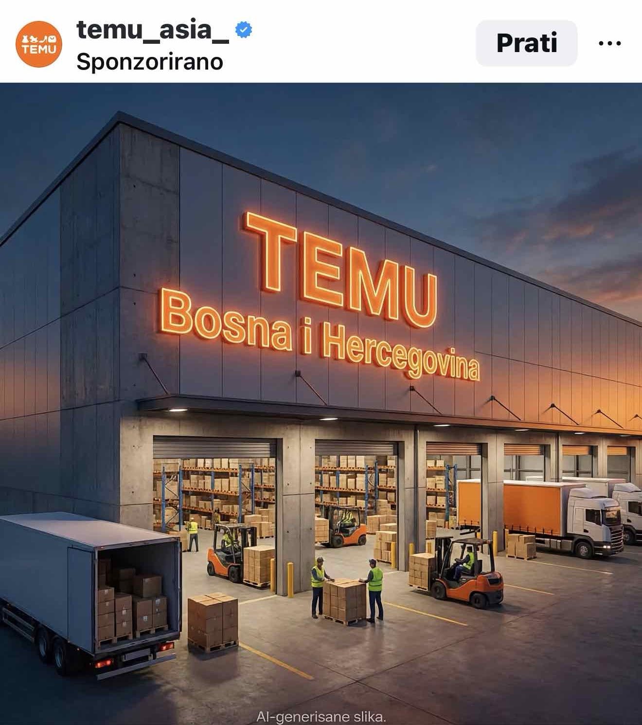 Na društvenim mrežama sve češće se pojavljuju sponzorisane objave platforme TEMU koje prate AI fotografije modernih logističkih centara sa natpisima poput ovoga sa fotografije “TEMU Bosna i Hercegovina”.