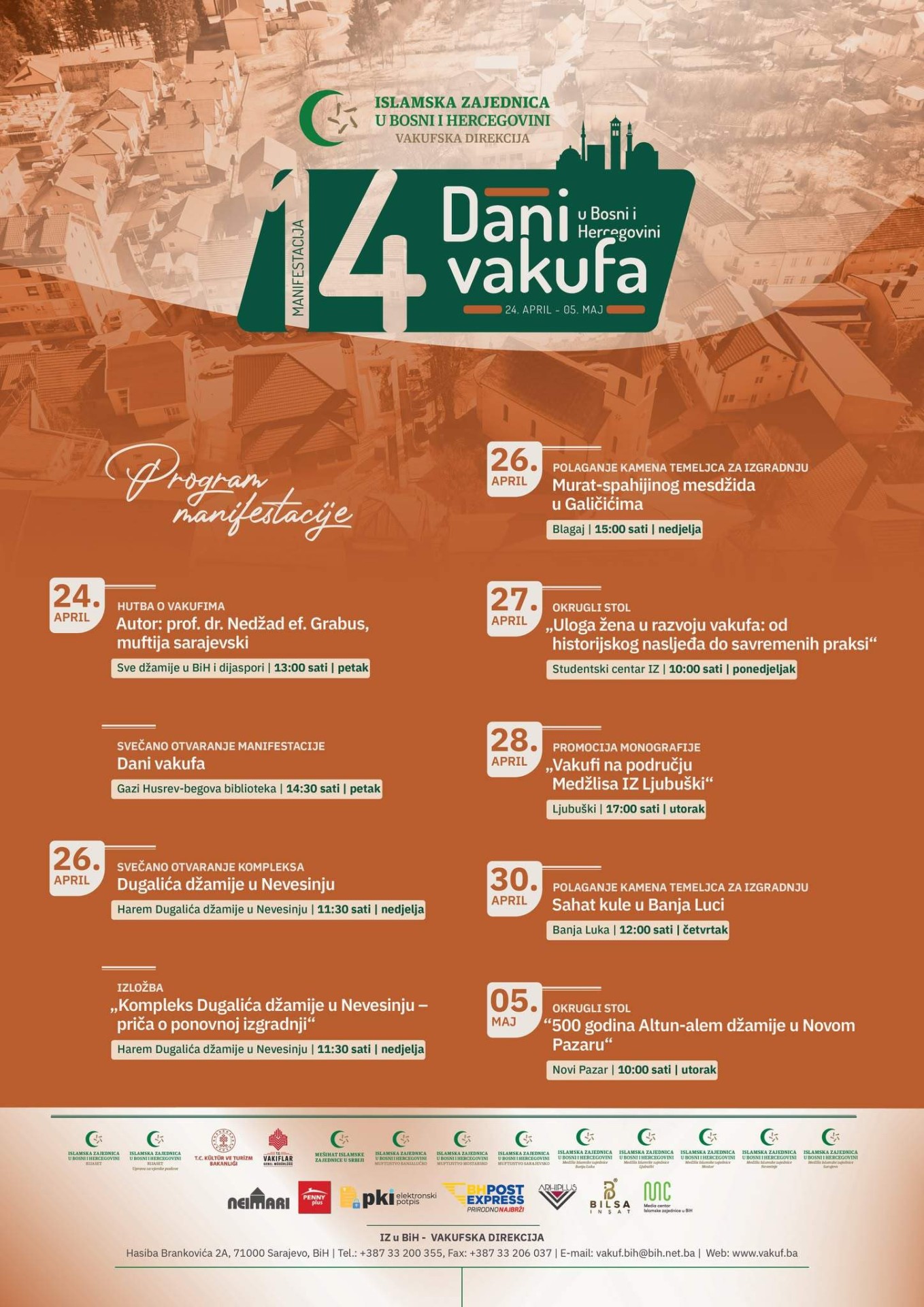 Manifestacija će trajati do 5. maja, a na dan otvorenja će u u svim džamijama u Bosni i Hercegovini i dijaspori biti pročitana hutba o vakufima, čiji je autor muftija sarajevski prof. dr. Nedžad-ef. Grabus.
