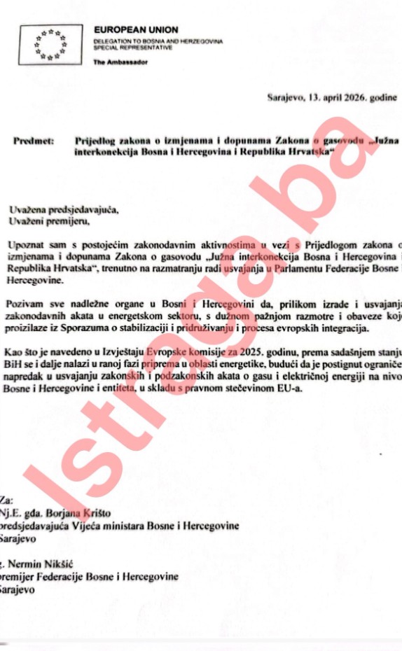 Dodaju da u pismu od 13. aprila, do kojeg je došao istraživački portal istraga.ba, a koje je vidio Guardian, zvaničnik EU Luigi Soreca naveo je da je, prema energetskom sporazumu između BiH i Brisela, „ključno da se nacrti zakona temeljito usklade“ s EU.