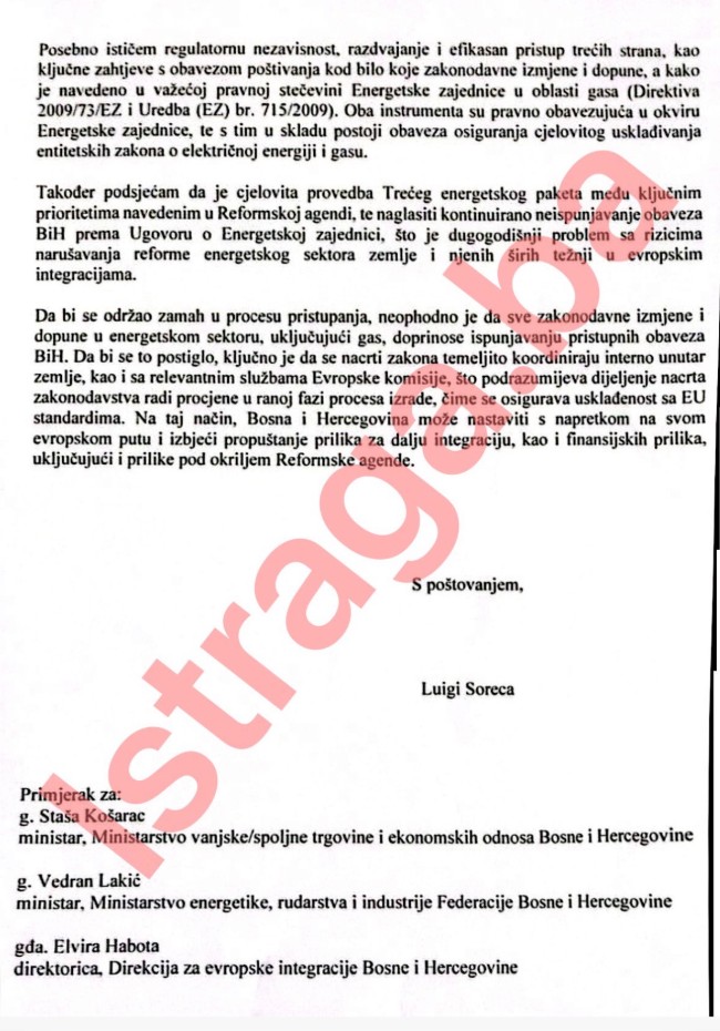 U pismu koje je 13. aprila ove godine Soreca poslao predsjedavajućoj Vijeća ministara BiH Borjani Krišto i premijeru FBiH Nerminu Nikšiću, Soreca je “pozvao sve nadležne organe u Bosni i Hercegovini da, prilikom izrade i usvajanja zakonodavnih akata u energetskom sektoru, s dužnom pažnjom razmotre i obaveze koje proizilaze iz Sporazuma o stabilizaciji i pridruživanju i procesa evropskih integracija”, prenosi Istraga.