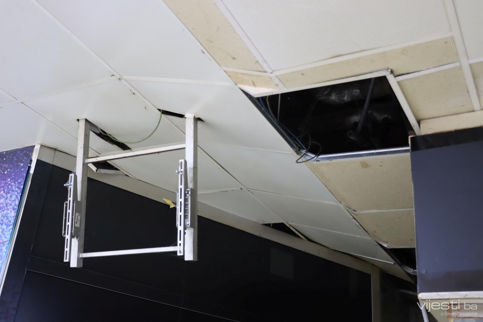 Ispod nadstrešnice nedostaje vidi se obrušen veliki betonski komad, a s plafona vise kablovi i instalacije, što ukazuje na ozbiljno urušavanje dijela objekta.